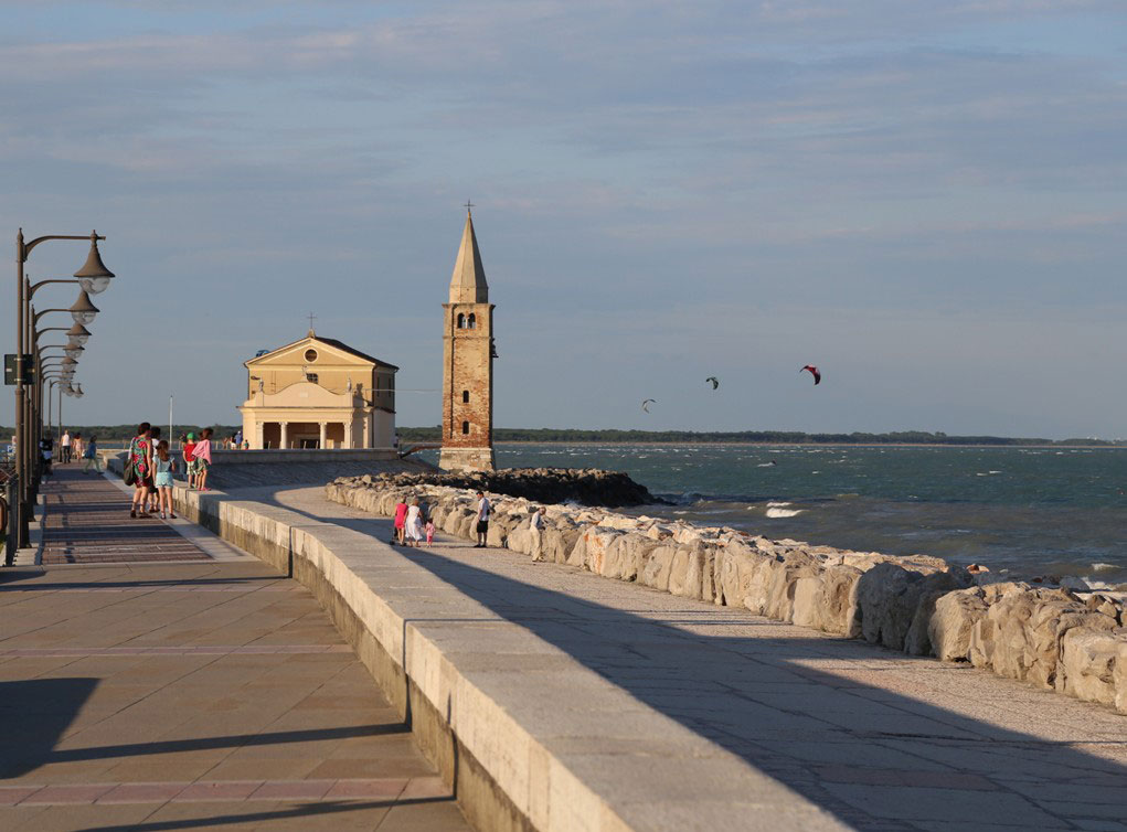 L’altro piccolo tesoro di Caorle è la settecentesca chiesa dedicata alla Madonna dell’Angelo, il cui campanile sul mare, funge da punto cospicuo, dotato di faro a luce bianca. Essa sorge su una penisoletta, con la facciata porticata orientata a ponente. Alla sua sinistra si trova la baia della Sacheta, antico porto di Caorle, che per secoli ricoverò bragozzi; mentre alla sua destra inizia la lunga diga di protezione, fatta di massi in tracheite euganea, che dal 1993 vengono abilmente scolpiti da vari artisti, che hanno creato la particolarissima passeggiata della Scogliera viva. Ma la Madonnina, protettrice dei pescatori, è prima di tutto, il luogo più caro alla devozione della popolazione locale, che con il suo carattere esuberante, conferisce a questa località balneare, quel tono unico, tutt’altro che artefatto che la caratterizza.
